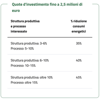 Il credito di imposta è riconosciuto a condizione che si realizzi una riduzione dei consumi energetici di almeno il 3% per la struttura produttiva o, in alternativa, di almeno il 5% del processo interessato dall'investimento. In particolare, la riduzione dei consumi energetici deve conseguire da investimenti in beni materiali e immateriali funzionali alla transizione tecnologica e digitale delle imprese secondo il modello “Industria 4.0” (Allegati A e B alla Legge 232/2016).